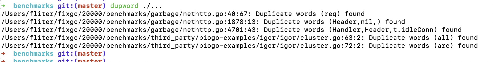 /Users/fliter/fixgo/20000/benchmarks/garbage/nethttp.go:40:67: Duplicate words (req) found /Users/fliter/fixgo/20000/benchmarks/garbage/nethttp.go:1878:13: Duplicate words (Header,nil,) found /Users/fliter/fixgo/20000/benchmarks/garbage/nethttp.go:4701:43: Duplicate words (Handler,Header,t.idleConn) found /Users/fliter/fixgo/20000/benchmarks/third_party/biogo-examples/igor/igor/cluster.go:63:2: Duplicate words (all) found /Users/fliter/fixgo/20000/benchmarks/third_party/biogo-examples/igor/igor/cluster.go:72:2: Duplicate words (are) found