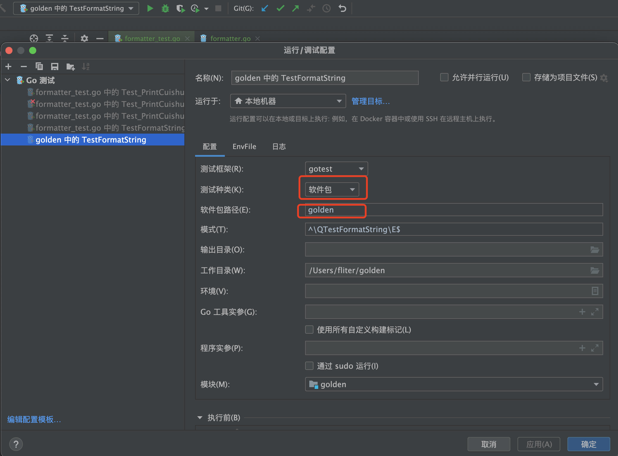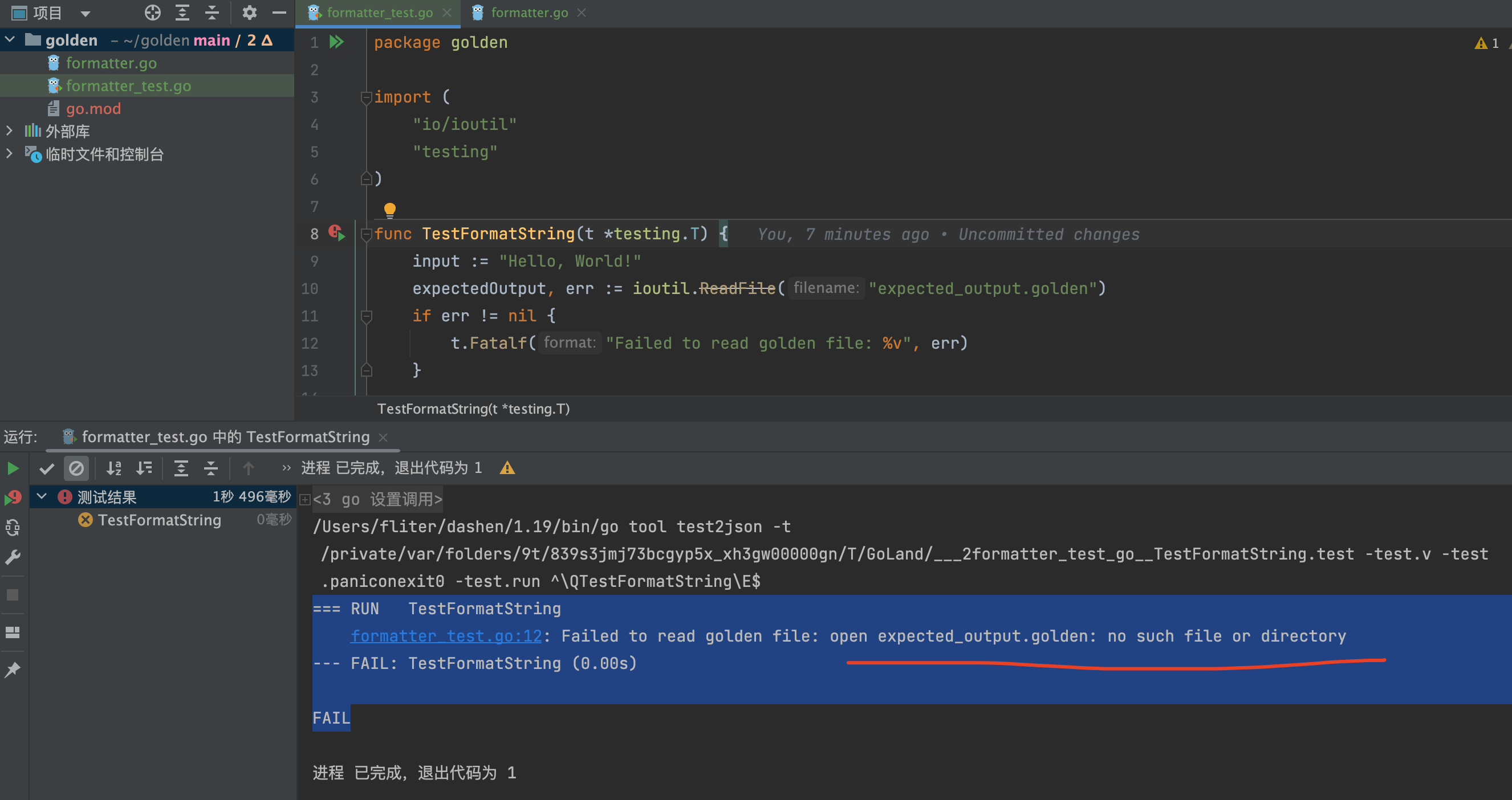 假设你有一个名为formatter.go的文件,其中包含一个FormatString函数用于格式化字符串。你还有一个测试文件formatter_test.go,其中包含一个测试用例来测试FormatString函数。