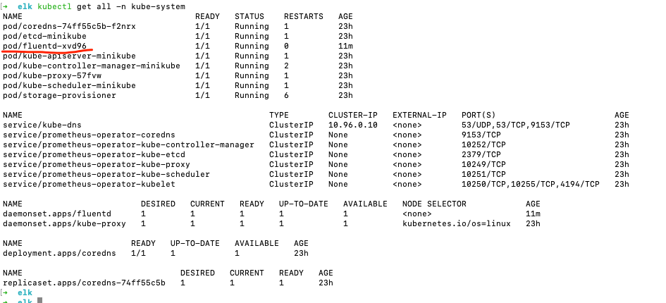 | kubectl describe po fluentd-xvd96 -n kube-system Name: fluentd-xvd96 Namespace: kube-system Priority: 0 Service Account: fluentd Node: minikube/192.168.49.2 Start Time: Fri, 30 Jun 2023 14:14:23 +0800 Labels: controller-revision-hash=769b886657 k8s-app=fluentd-logging kubernetes.io/cluster-service=true pod-template-generation=1 version=v1 Annotations: <none> Status: Running IP: 172.17.0.10 IPs: IP: 172.17.0.10 Controlled By: DaemonSet/fluentd Containers: fluentd: Container ID: docker://b1dafd815c311280ed771b244249af18d4750bcb35495ad4c847d6968a1a4ab1 Image: fluent/fluentd-kubernetes-daemonset:v1-debian-elasticsearch Image ID: docker-pullable://fluent/fluentd-kubernetes-daemonset@sha256:c3a0797e96b544b8b1a9899a322bc54fffafee90a079b7ae7e78dde6f569a5a4 Port: <none> Host Port: <none> State: Running Started: Fri, 30 Jun 2023 14:20:51 +0800 Ready: True Restart Count: 0 Limits: memory: 200Mi Requests: cpu: 100m memory: 200Mi Environment: FLUENT_ELASTICSEARCH_HOST: elasticsearch.logging FLUENT_ELASTICSEARCH_PORT: 9200 FLUENT_ELASTICSEARCH_SCHEME: http FLUENT_UID: 0 FLUENTD_SYSTEMD_CONF: disable Mounts: /var/lib/docker/containers from varlibdockercontainers (ro) /var/log from varlog (rw) /var/run/secrets/kubernetes.io/serviceaccount from fluentd-token-mrn96 (ro) Conditions: Type Status Initialized True Ready True ContainersReady True PodScheduled True Volumes: varlog: Type: HostPath (bare host directory volume) Path: /var/log HostPathType: varlibdockercontainers: Type: HostPath (bare host directory volume) Path: /var/lib/docker/containers HostPathType: fluentd-token-mrn96: Type: Secret (a volume populated by a Secret) SecretName: fluentd-token-mrn96 Optional: false QoS Class: Burstable Node-Selectors: <none> Tolerations: node-role.kubernetes.io/master:NoSchedule node.kubernetes.io/disk-pressure:NoSchedule op=Exists node.kubernetes.io/memory-pressure:NoSchedule op=Exists node.kubernetes.io/not-ready:NoExecute op=Exists node.kubernetes.io/pid-pressure:NoSchedule op=Exists node.kubernetes.io/unreachable:NoExecute op=Exists node.kubernetes.io/unschedulable:NoSchedule op=Exists Events: Type Reason Age From Message ---- ------ ---- ---- ------- Normal Scheduled 11m default-scheduler Successfully assigned kube-system/fluentd-xvd96 to minikube Normal Pulling 11m kubelet Pulling image "fluent/fluentd-kubernetes-daemonset:v1-debian-elasticsearch" Normal Pulled 5m14s kubelet Successfully pulled image "fluent/fluentd-kubernetes-daemonset:v1-debian-elasticsearch" in 6m22.241646424s Normal Created 5m13s kubelet Created container fluentd Normal Started 5m12s kubelet Started container fluentd