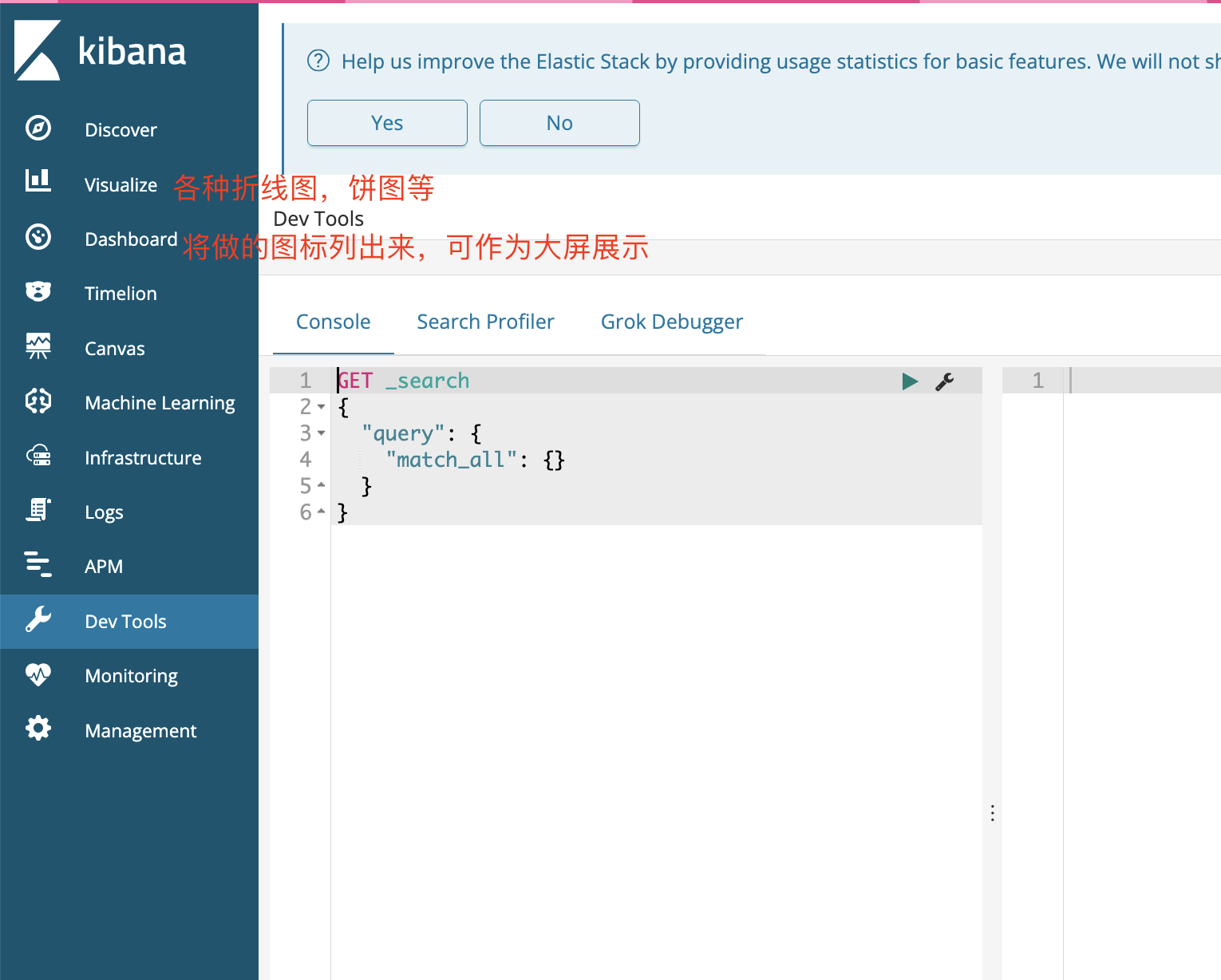 Dev Tools(开发者工具):提供了一个强大的开发者控制台,可以执行 Elasticsearch 查询和操作,以及调试和测试相关的 API 请求。