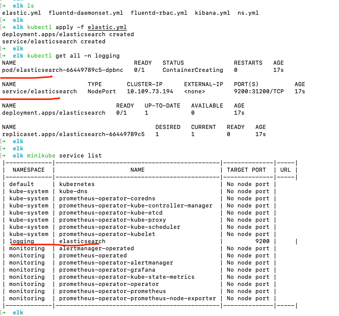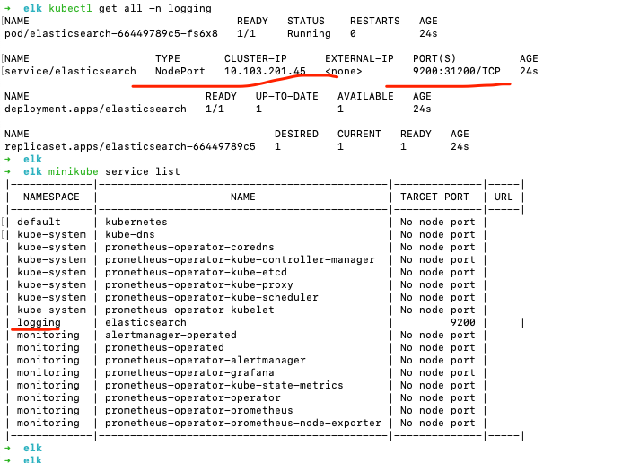 service/elasticsearch NodePort 10.109.73.194 9200:31200/TCP 24m