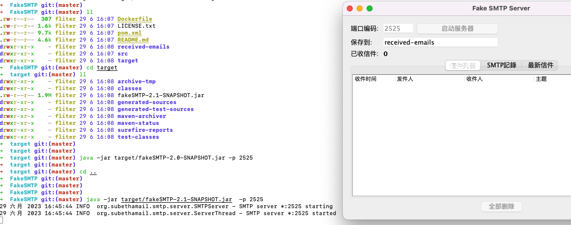 现在需要改为 java -jar target/fakeSMTP-2.1-SNAPSHOT.jar -p 2525