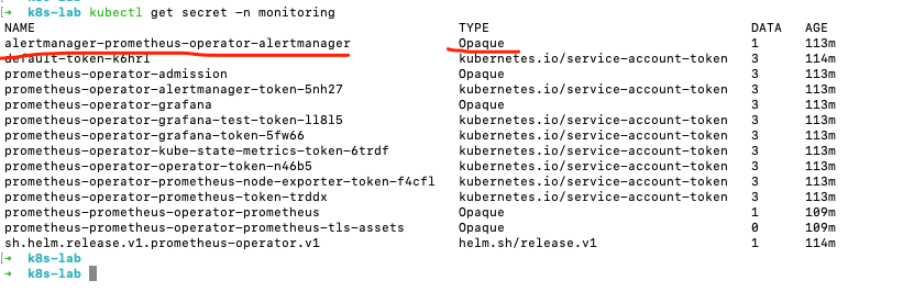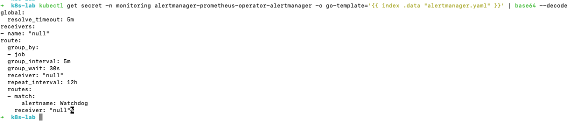 kubectl get secret -n monitoring alertmanager-prometheus-operator-alertmanager -o go-template='左括号 左括号 index .data "alertmanager.yaml" 右括号 右括号' | base64 --decode (把汉字替换为对应符号,不这样hexo会解析出错)