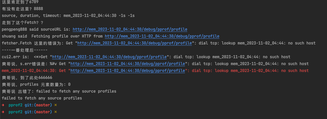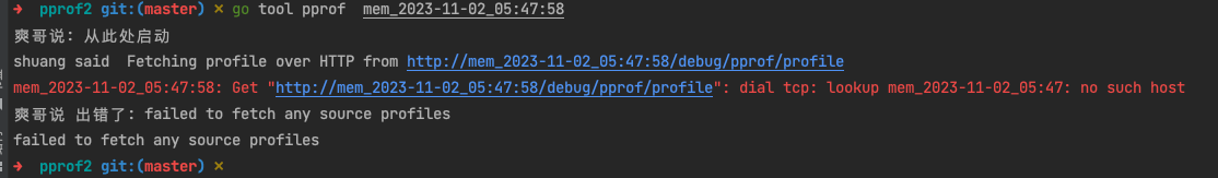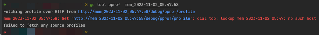 Fetching profile over HTTP from http://mem_2023-11-02_05:47:58/debug/pprof/profile mem_2023-11-02_05:47:58: Get "http://mem_2023-11-02_05:47:58/debug/pprof/profile": dial tcp: lookup mem_2023-11-02_05:47: no such host failed to fetch any source profiles