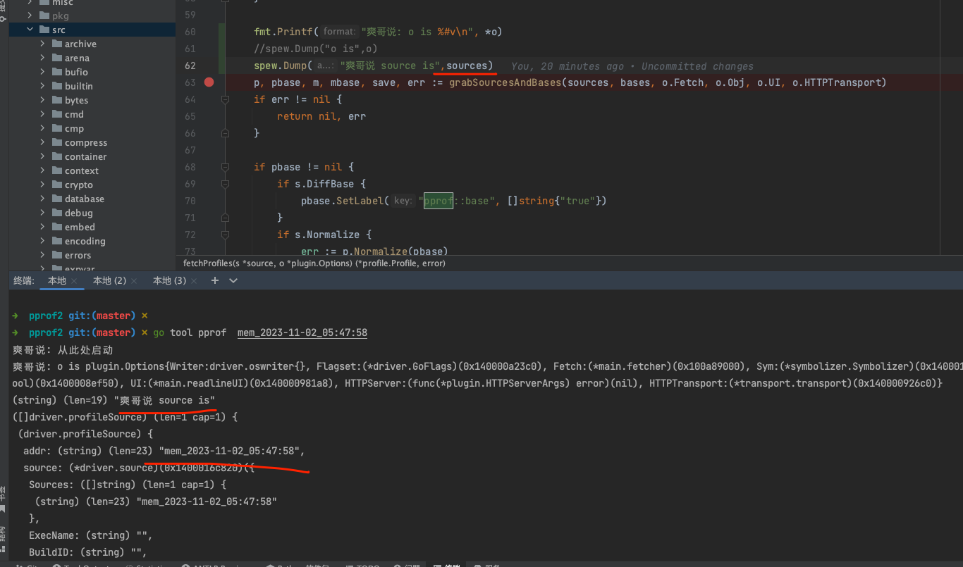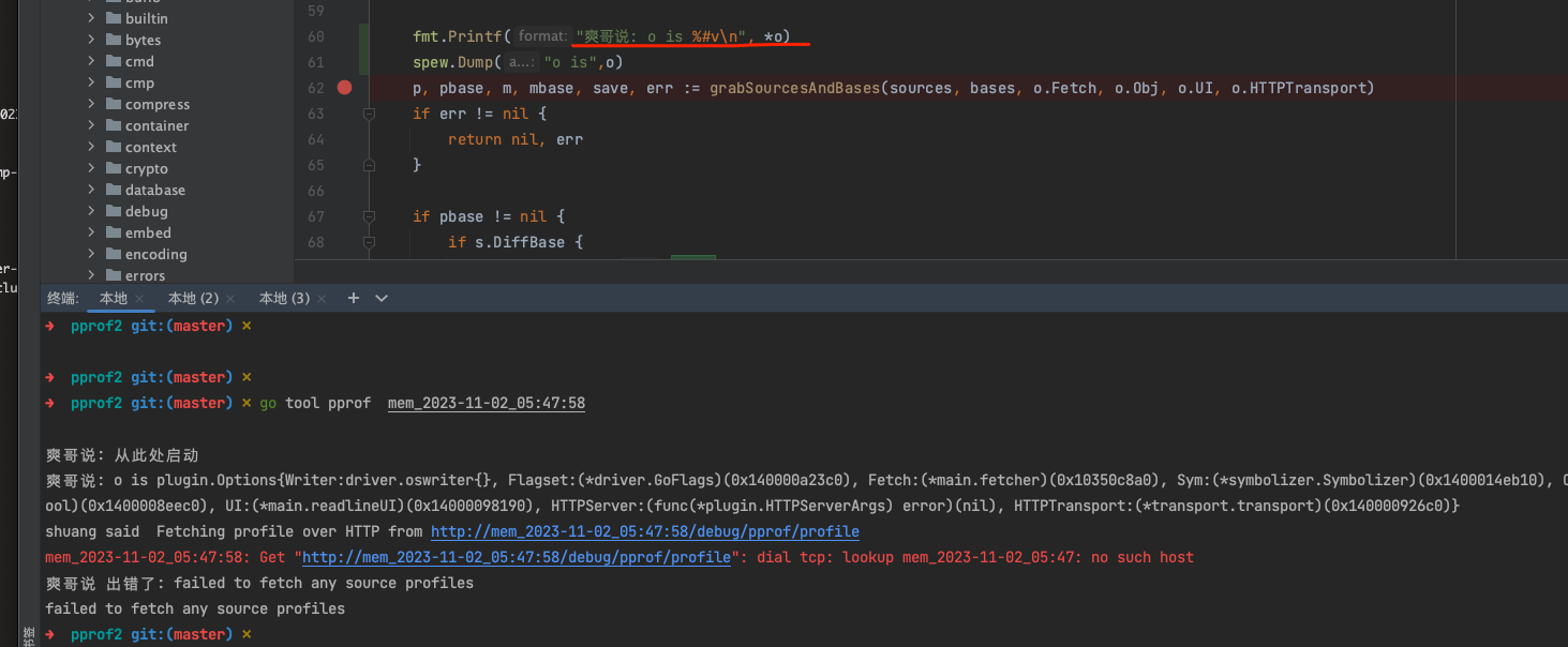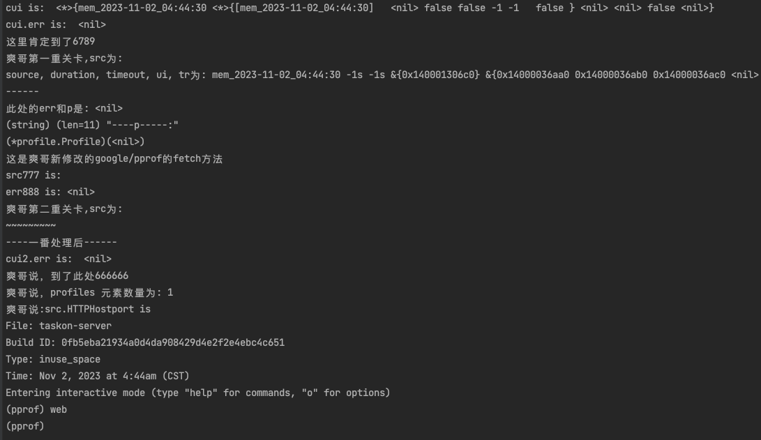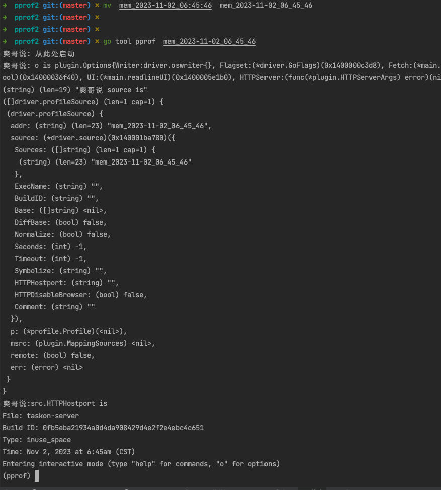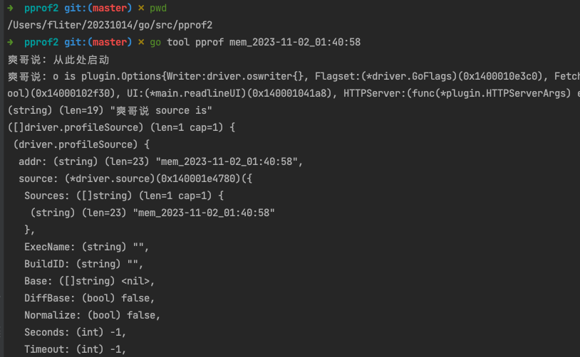 而后回到 /Users/fliter/20231014/go/src/pprof2 目录下,再次执行 go tool pprof mem_2023-11-02_04:44:30
