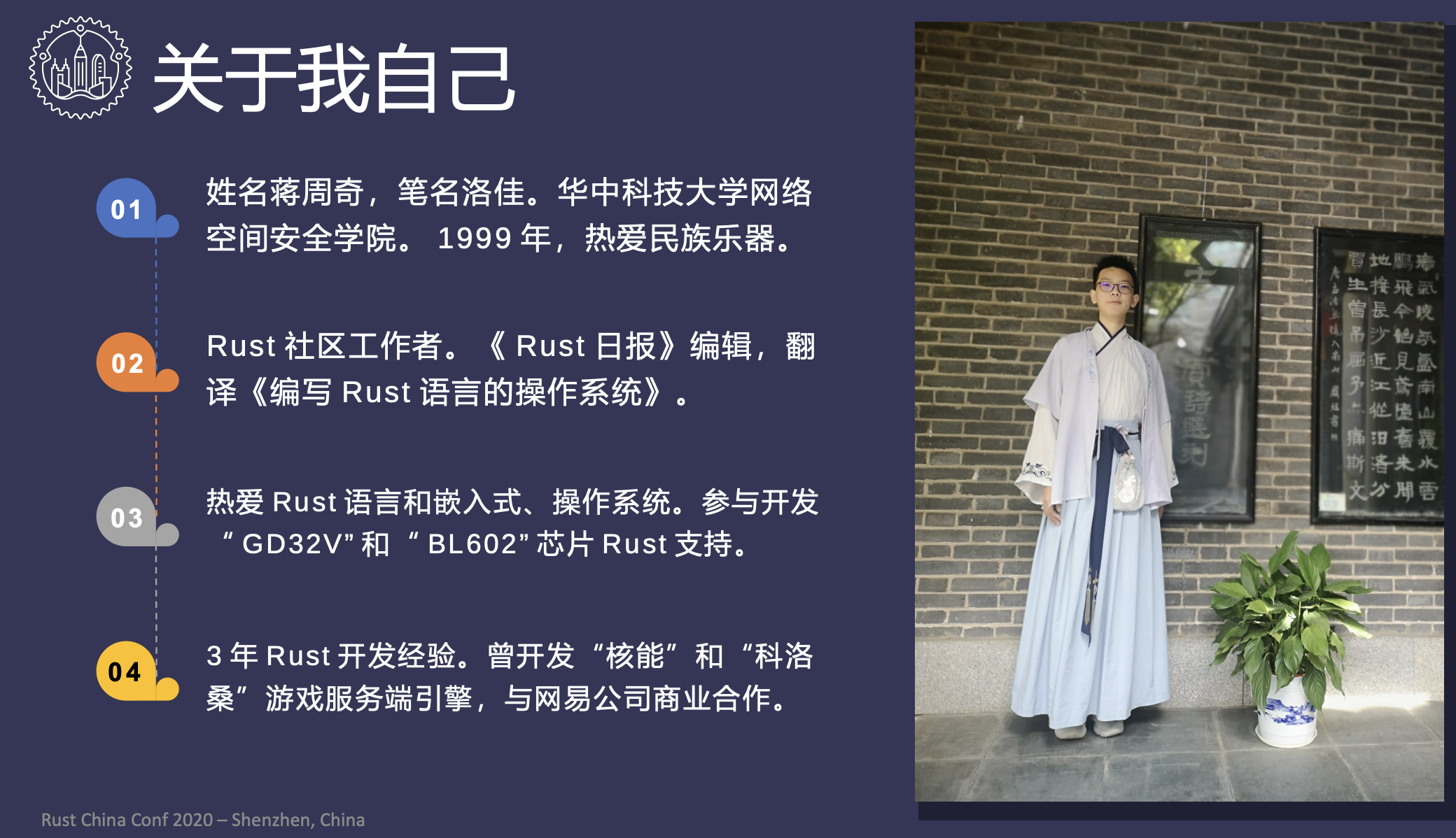 - 洛佳,华中科技大学网络空间安全学院大四学生,RustSBI 作者