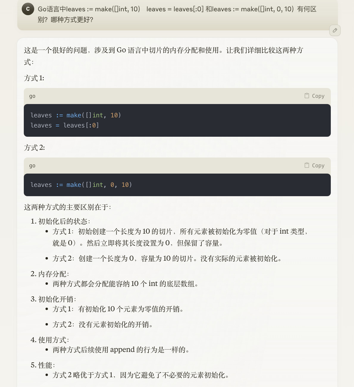总的来说,方式 2 leaves := make([]int, 0, 10) 通常被认为是更好的做法,原因如下: