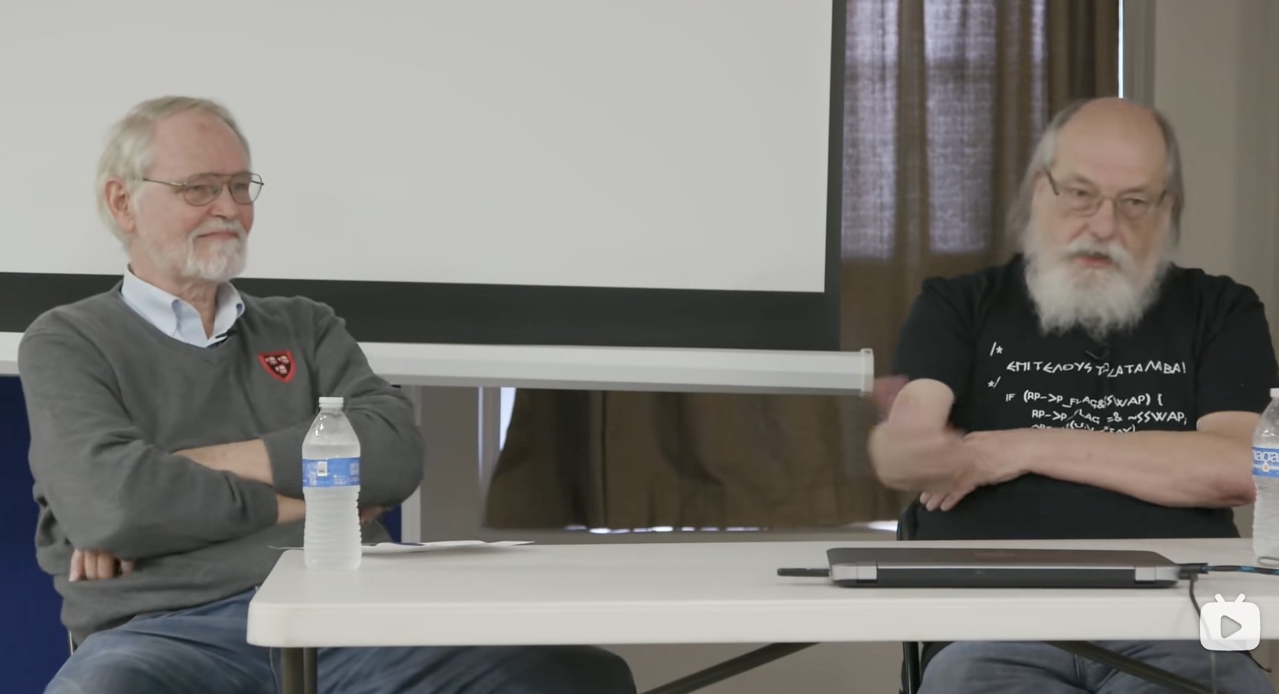 不幸的是,这是那种非常偶然的机会,完全是运气好,我正好在跟Ken同一个组。我办公室就在他对面,差不多有30年。我们在2000年几乎同一天退休,各奔东西,但一直保持联系。实际上,这周应该是我们自离开贝尔实验室以来第一次见面。他一点也没变。所以这次见面很有趣。星期二他在普林斯顿的我的课堂上做了一个客座演讲,那个小组比今天的观众要小得多,当然也年轻得多,或许穿的T恤也不太一样(笑)。无论如何,我们度过了愉快的时光,这是炉边访谈的想法。所以今天我们要做的基本上是一样的。我会问Ken一些引导性问题,让他尽量多说些话。然后在中途,我们会鼓励观众提问。好吧,这就是我们的计划。我把我的小笔记拿出来,一张纸,两张,字很小。是的,好吧。顺便提一下,埃文没有提到的是,Ken显然是和Dennis Ritchie一起创造了我们都熟悉并使用了很长时间的Unix操作系统。他因为这个贡献获得了许多奖项,我就不一一列举了,不过其中包括1983年的ACM图灵奖、国家技术奖章和日本奖。Ken是国家工程院和国家科学院的成员。他通常住在加州,这次来东海岸的原因是星期四他在华盛顿特区被引入国家发明家名人堂。