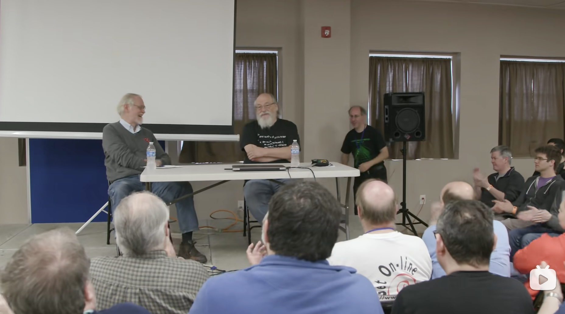 Can we have a vendor room by the front lobby? We have a huge consignment thing down the hall here, the software store. We have glitch works workshop, Singapore computers learn to solder workshop. Our museum will be open. The rest of the museum, Soviet as well. Down the street, the satellite dish and food, all this stuff has to be staffed by our volunteers. So after this speech, let them do their job. Give them 10,50 minutes to open everything up so the exhibitors can get through exhibits before you guys do. But you didn’t come to hear me. So Amanda, does anyone not know who Kim Thompson is? Okay, okay, good. Without any further delay, Mister Ken Thompson, co inventor of Unix.
